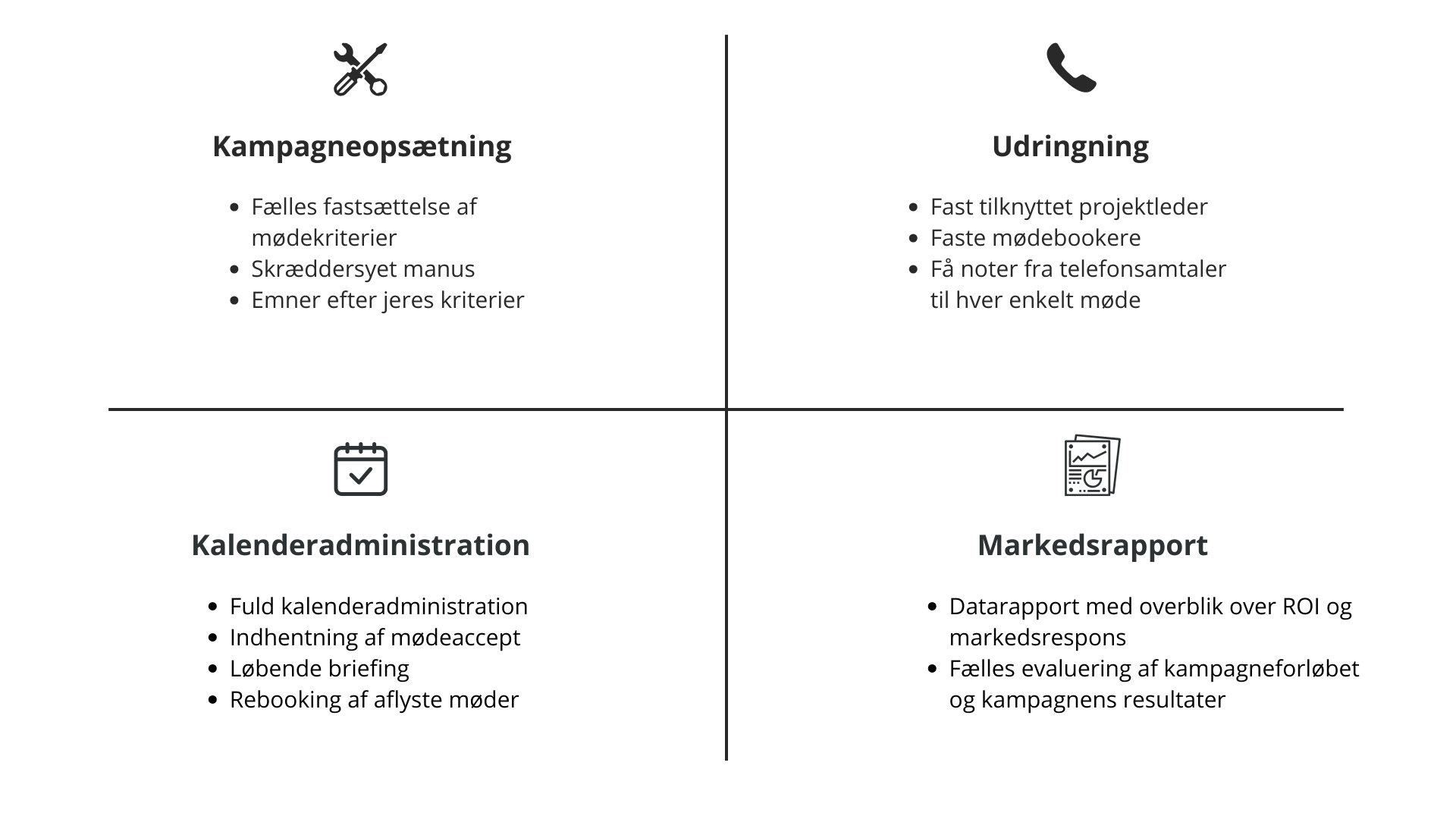Vi ved godt, at mødebooking kun er en god investering, når det giver afkast på møderne. Derfor samarbejder vi med alle vores kunder om deres slutsalg og har kontinuerlig dialog om mødekvaliteten, samler markedsdata ind og justerer løbende og dynamisk så alle bliver tilfredse